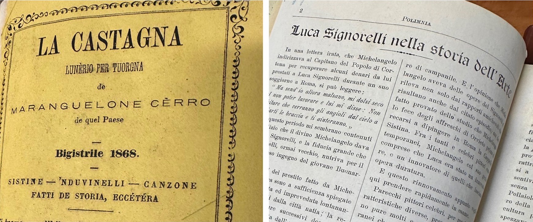 Si tratta di pubblicazioni come «La Castagna», un lunario realizzato da Francesco Chiericoni, meglio conosciuto come «Maranguelone da Tornia», con numeri che partono dal 1868. Incluso nel progetto di digitalizzazione c’è anche il periodico «L’Etruria», dal primo numero del 1892 fino al 1950 sotto le direzioni di Ezio Cosatti, Ugo Bistacci, Don Francesco Maffei, Alfonso Antonini e Raimondo Bistacci. Non manca una pubblicazione prettamente culturale come «Polimnia», periodico trimestrale diretto da Gilberto Brunacci, dal 1923 al 1933, che si definiva «Bollettino mensile, d’arte storia della Valdichiana e delle provincie finitime», poi assorbito dagli annuari dell’Accademia Etrusca.